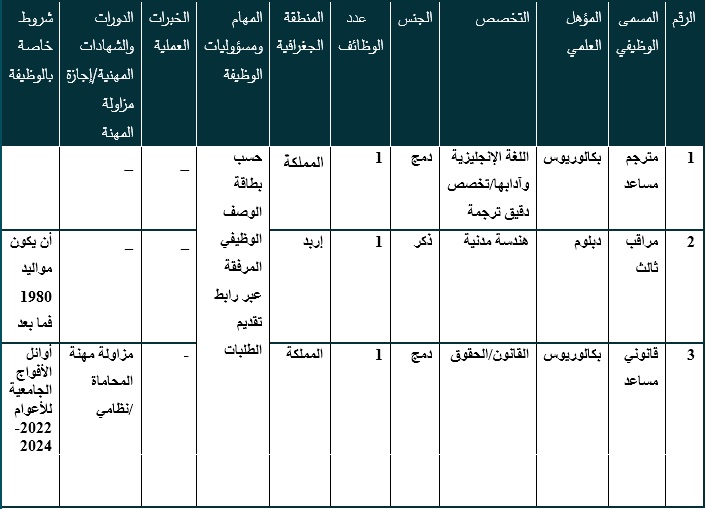 - لا يجوز تقديم طلب التوظيف من أوائل الأفواج الجامعية من المتقاعدين العسكريين والمدنيين والعاملين في القطاع المدني والعسكري والجامعات الرسمية والبلديات وأمانة عمان والمجلس الأعلى للعلوم والتكنولوجيا والمراكز العلمية التابعة له.